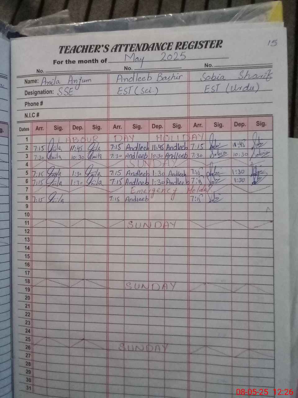 | CNIC | Full Name | Designation | R/C | Absence During Last Calender Month |