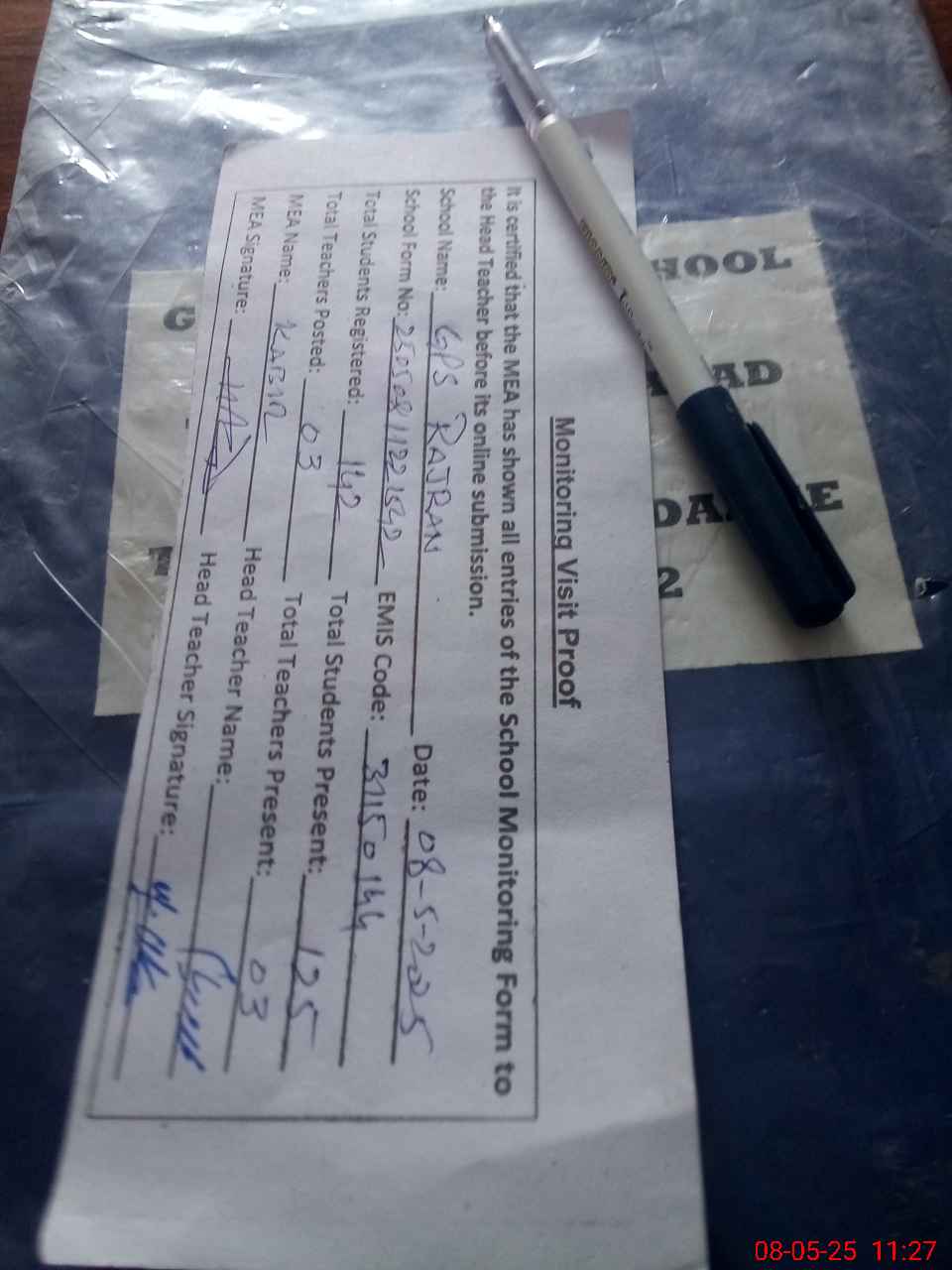 | Attendance Register | Head Teacher | MEA with School | Visit Proof |