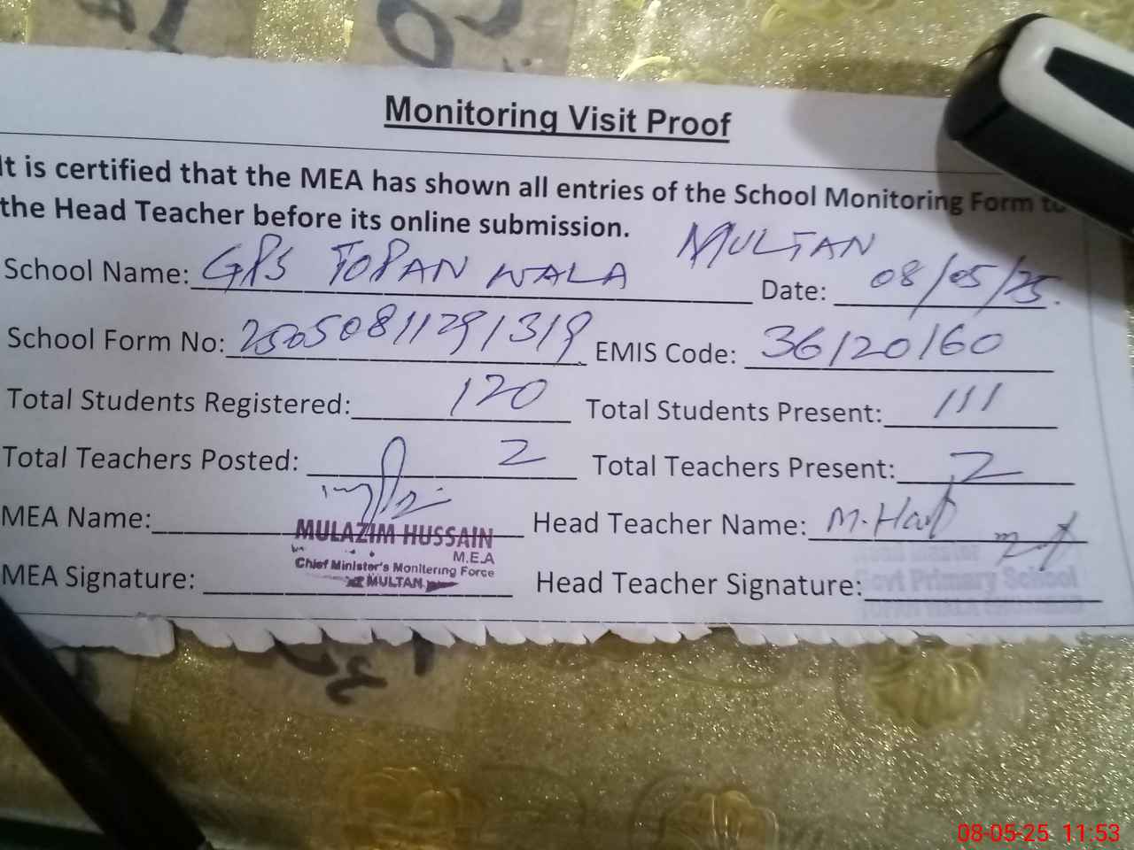 | Attendance Register | Head Teacher | MEA with School | Visit Proof |