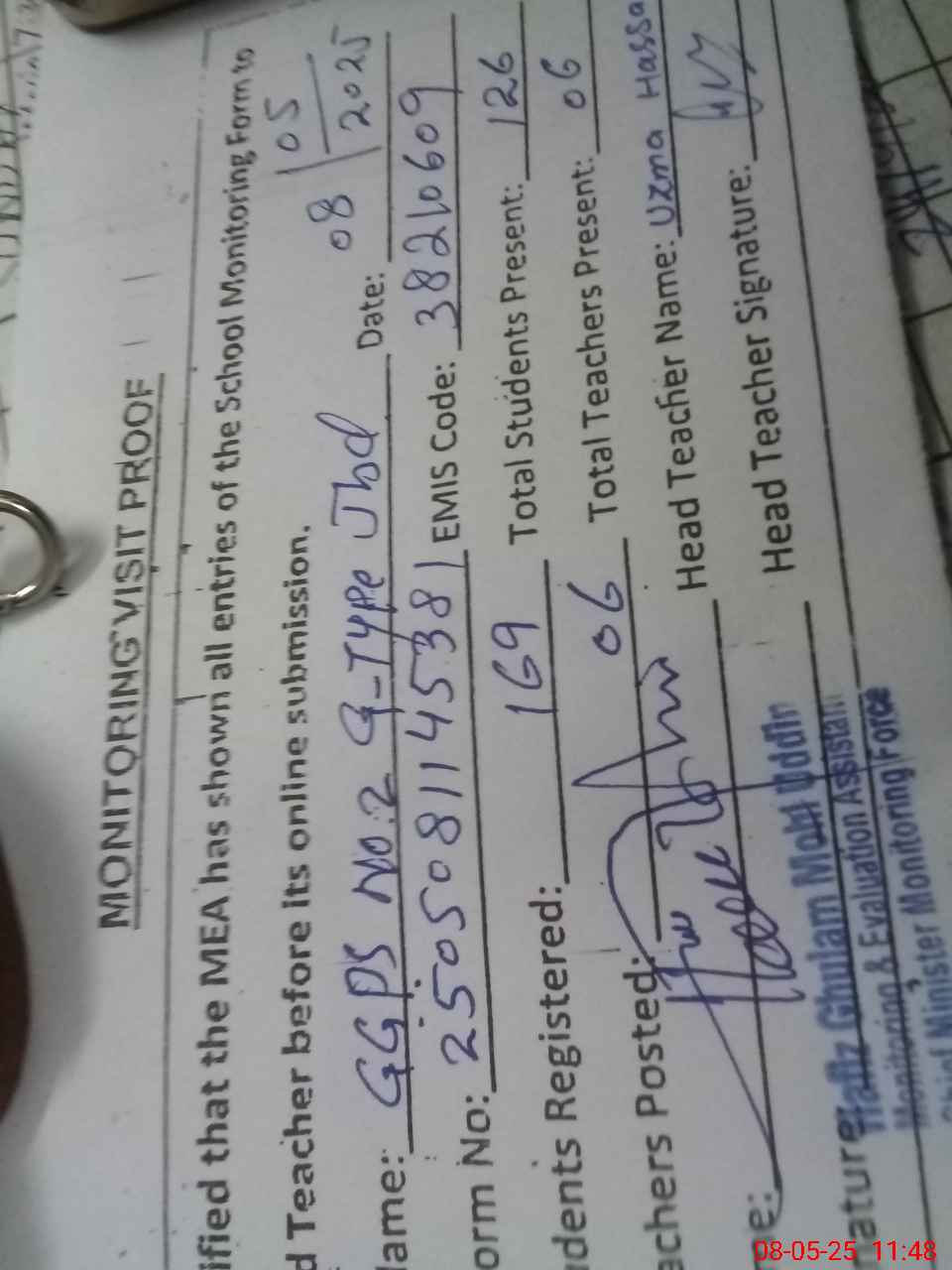 | Attendance Register | Head Teacher | MEA with School | Visit Proof |