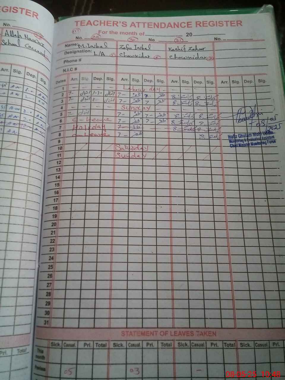 | CNIC | Full Name | Designation | R/C | Absence During Last Calender Month |