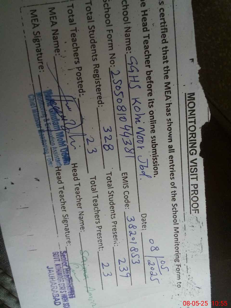 | Attendance Register | Head Teacher | MEA with School | Visit Proof |