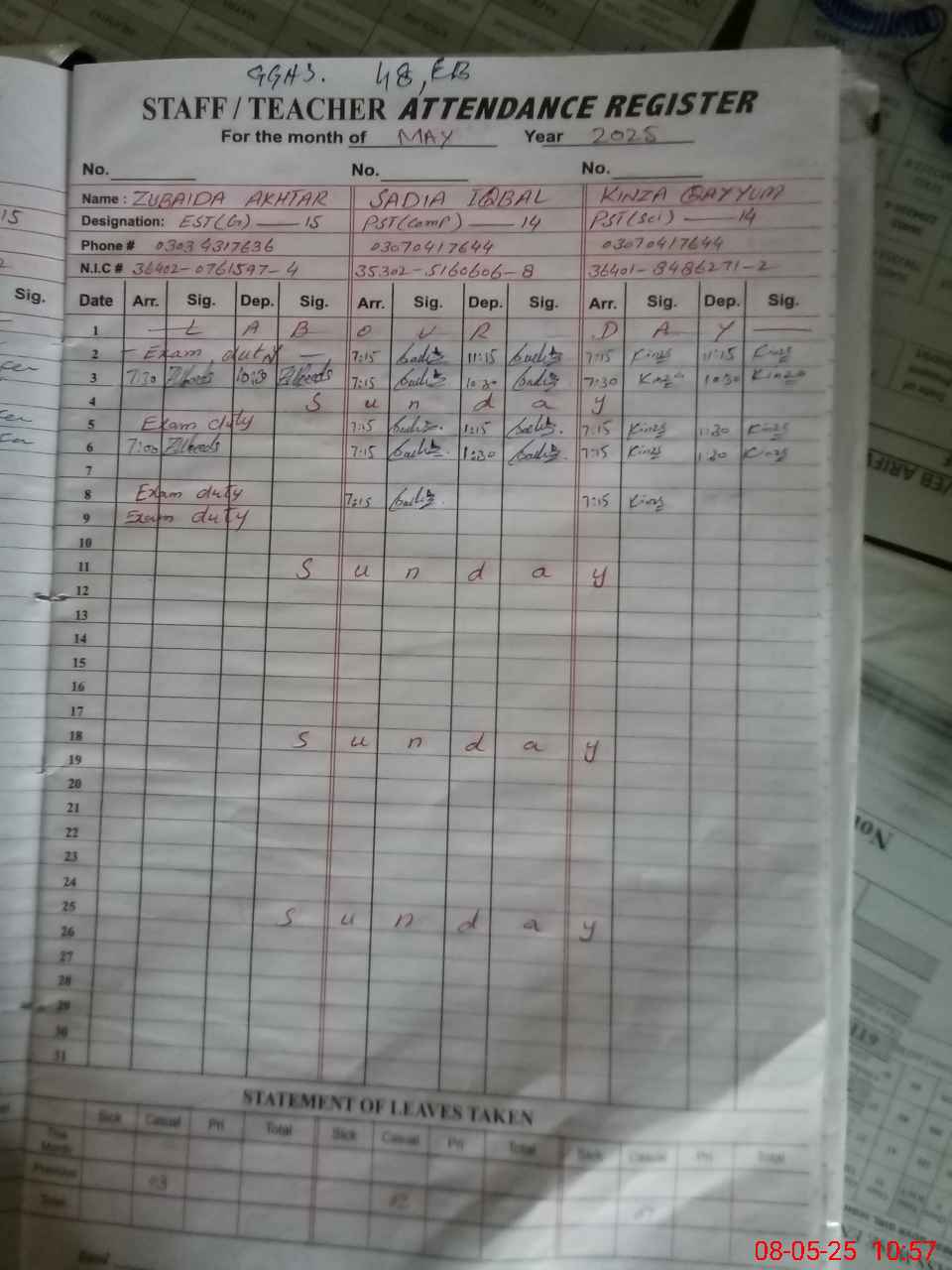 | 36**** | Zu**** Ak**** | Regular | 1 | 1 | 0 | 0 | 0 | 0 | 0 | 0 | 1 | Exam Duty | |