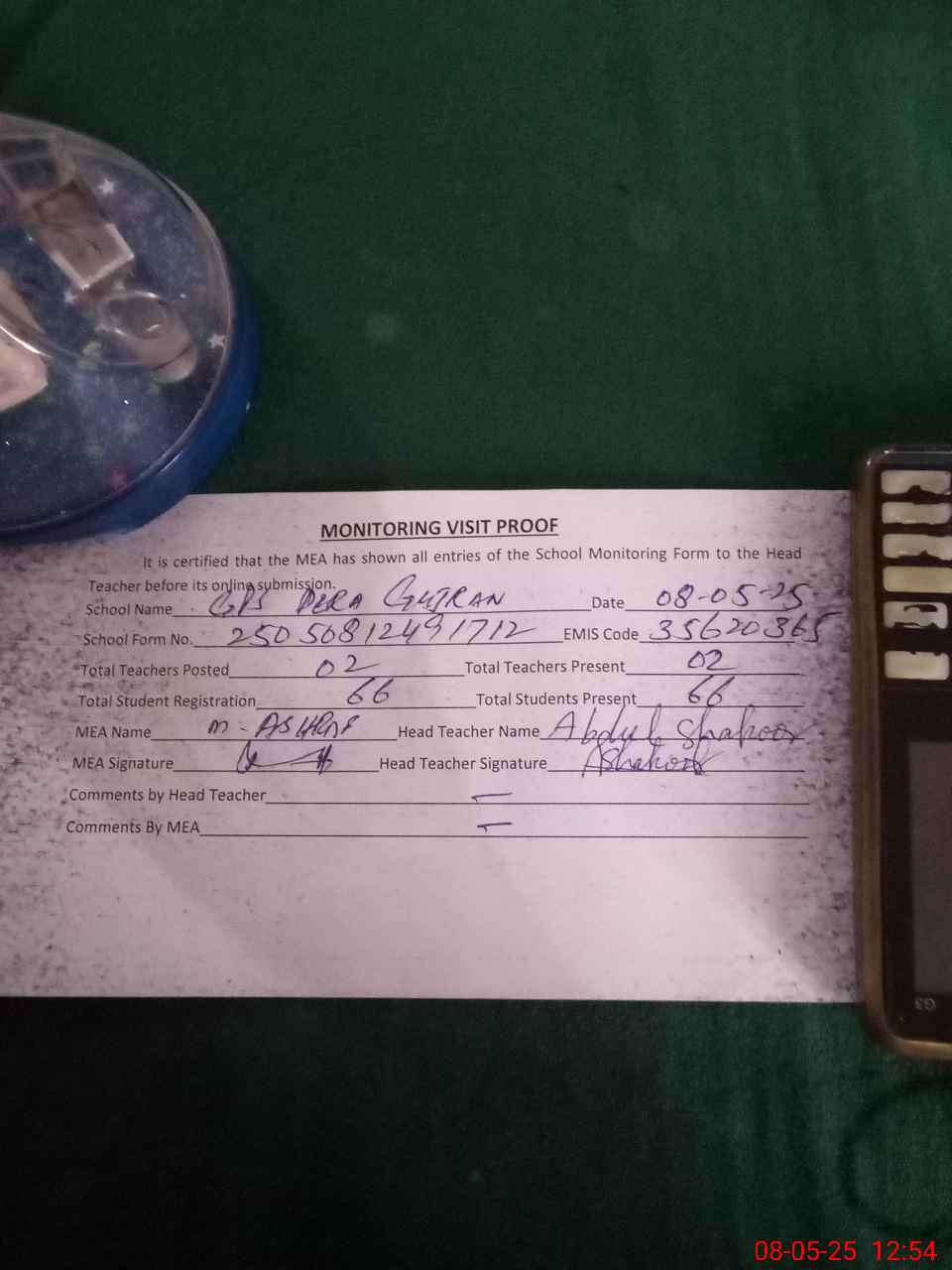 | Attendance Register | Head Teacher | MEA with School | Visit Proof |