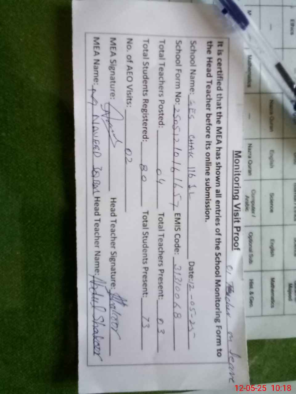 | Attendance Register | Head Teacher | MEA with School | Visit Proof |