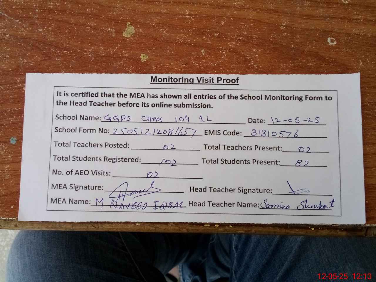 | Attendance Register | Head Teacher | MEA with School | Visit Proof |