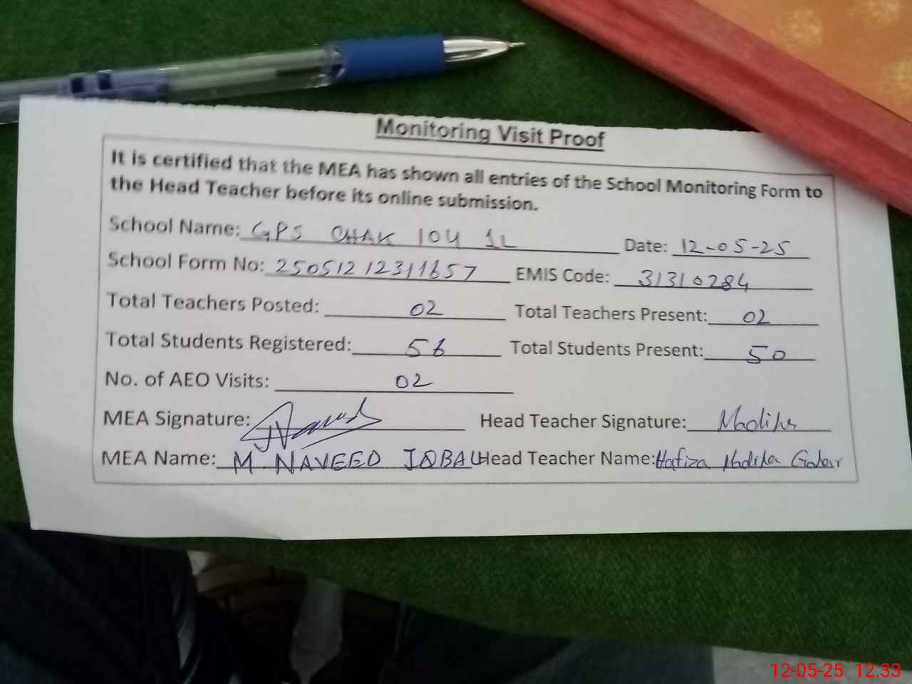 | Attendance Register | Head Teacher | MEA with School | Visit Proof |
