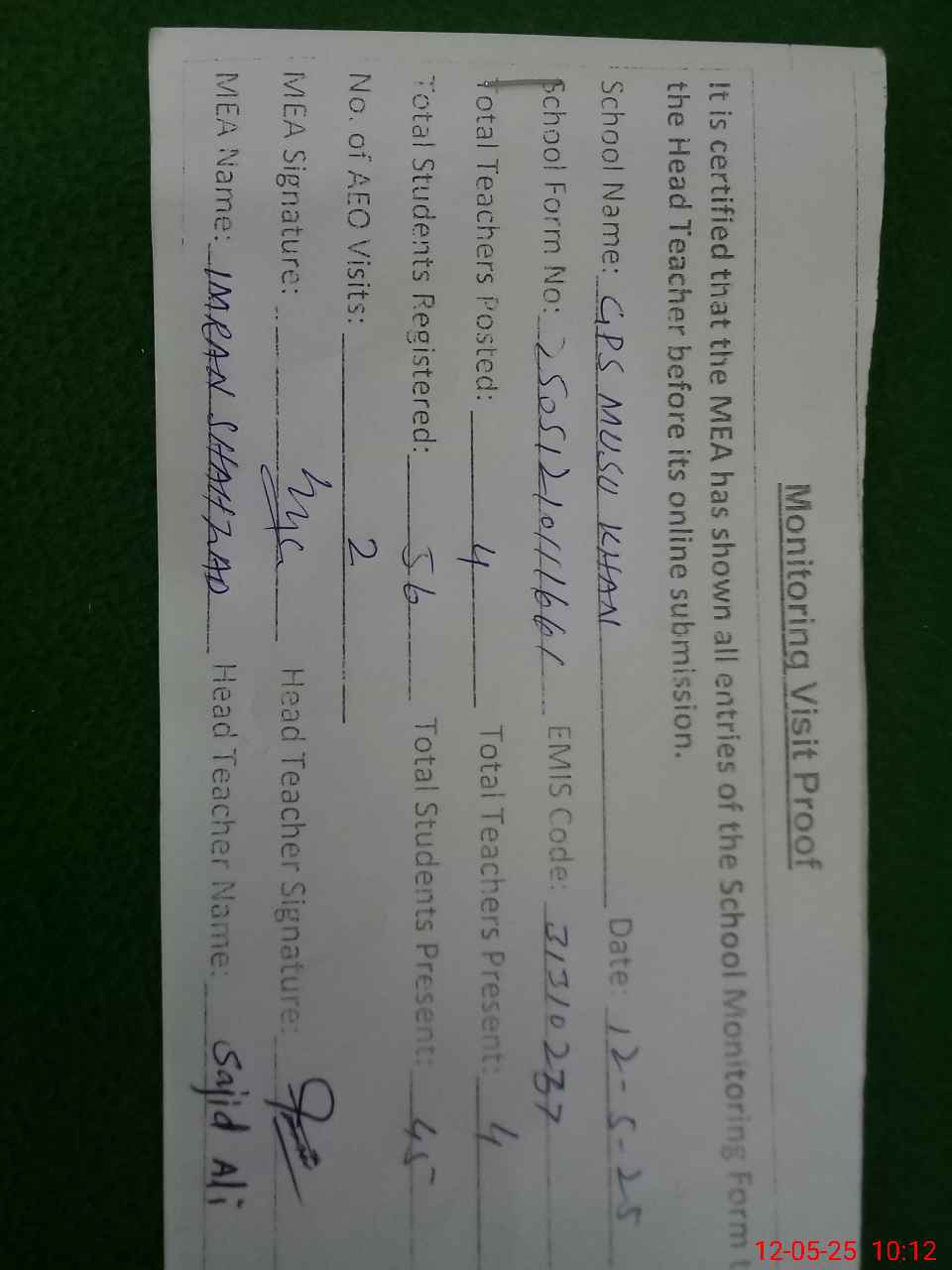 | EMIS Code: 31310237 | Name of School: GPS MUSU KHAN | |||
