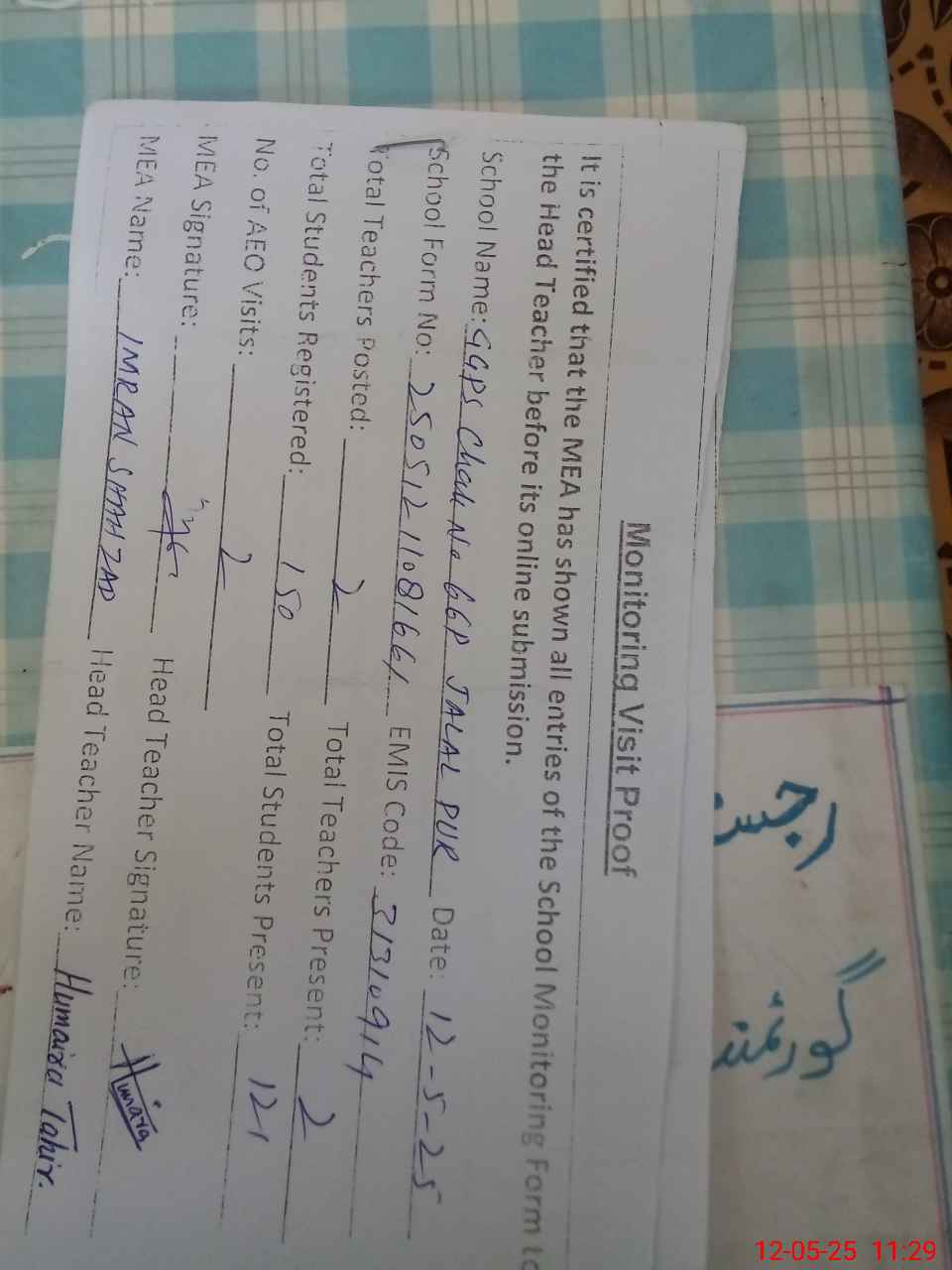 | Attendance Register | Head Teacher | MEA with School | Visit Proof |