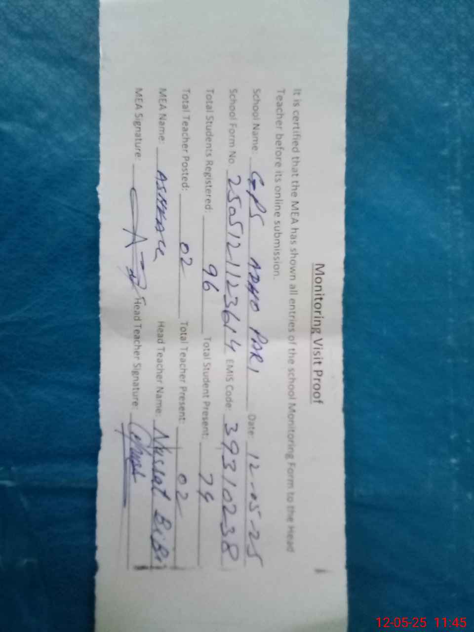 | Attendance Register | Head Teacher | MEA with School | Visit Proof |