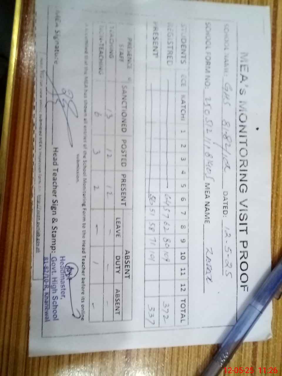 | Attendance Register | Head Teacher | MEA with School | Visit Proof |