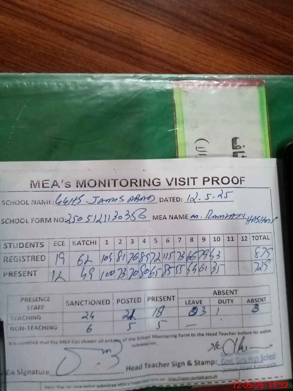 | EMIS Code: 36410096 | Name of School: GGHS JAMES ABAD, KABIRWALA | |||
