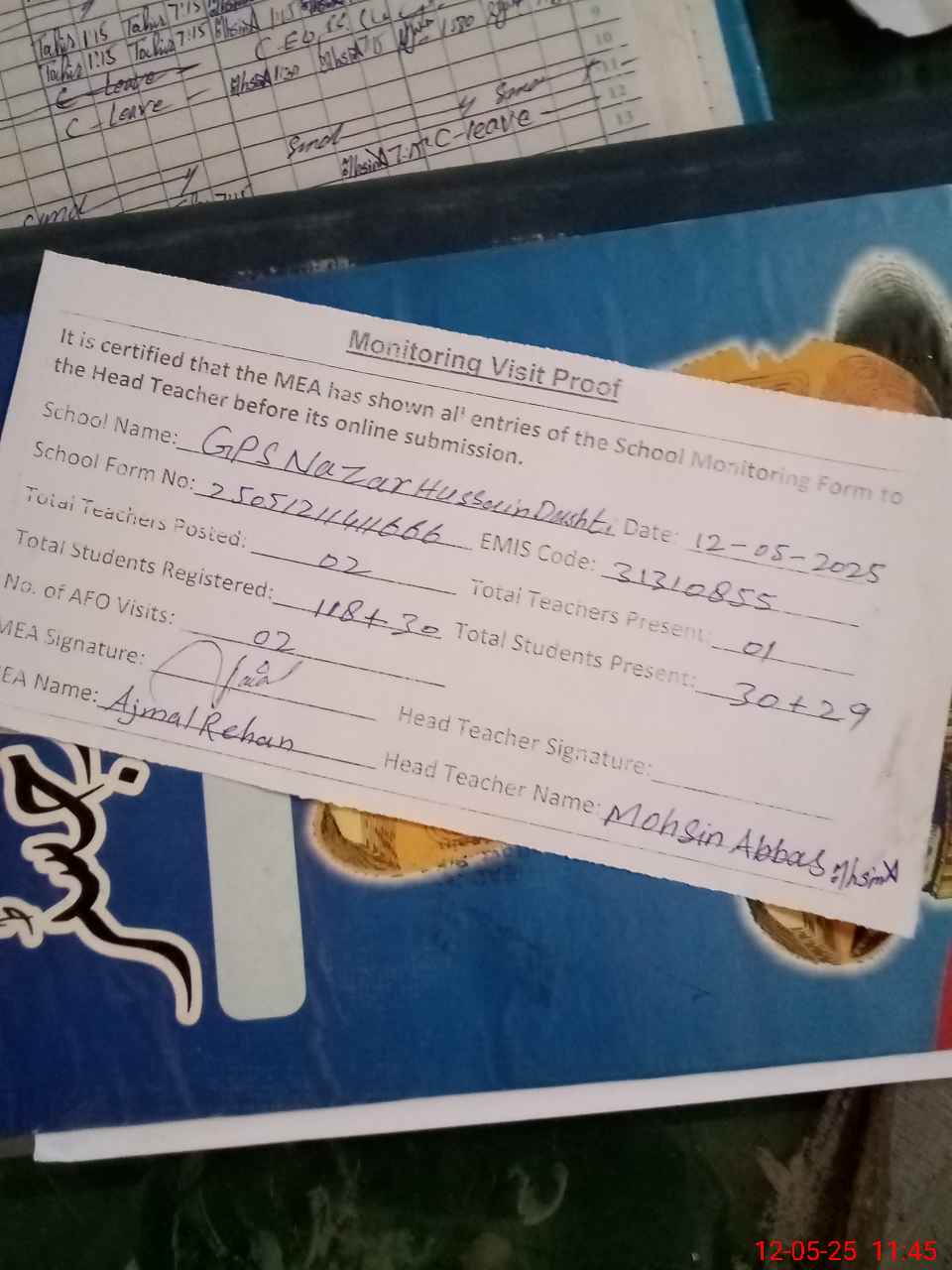 | Attendance Register | Head Teacher | MEA with School | Visit Proof |