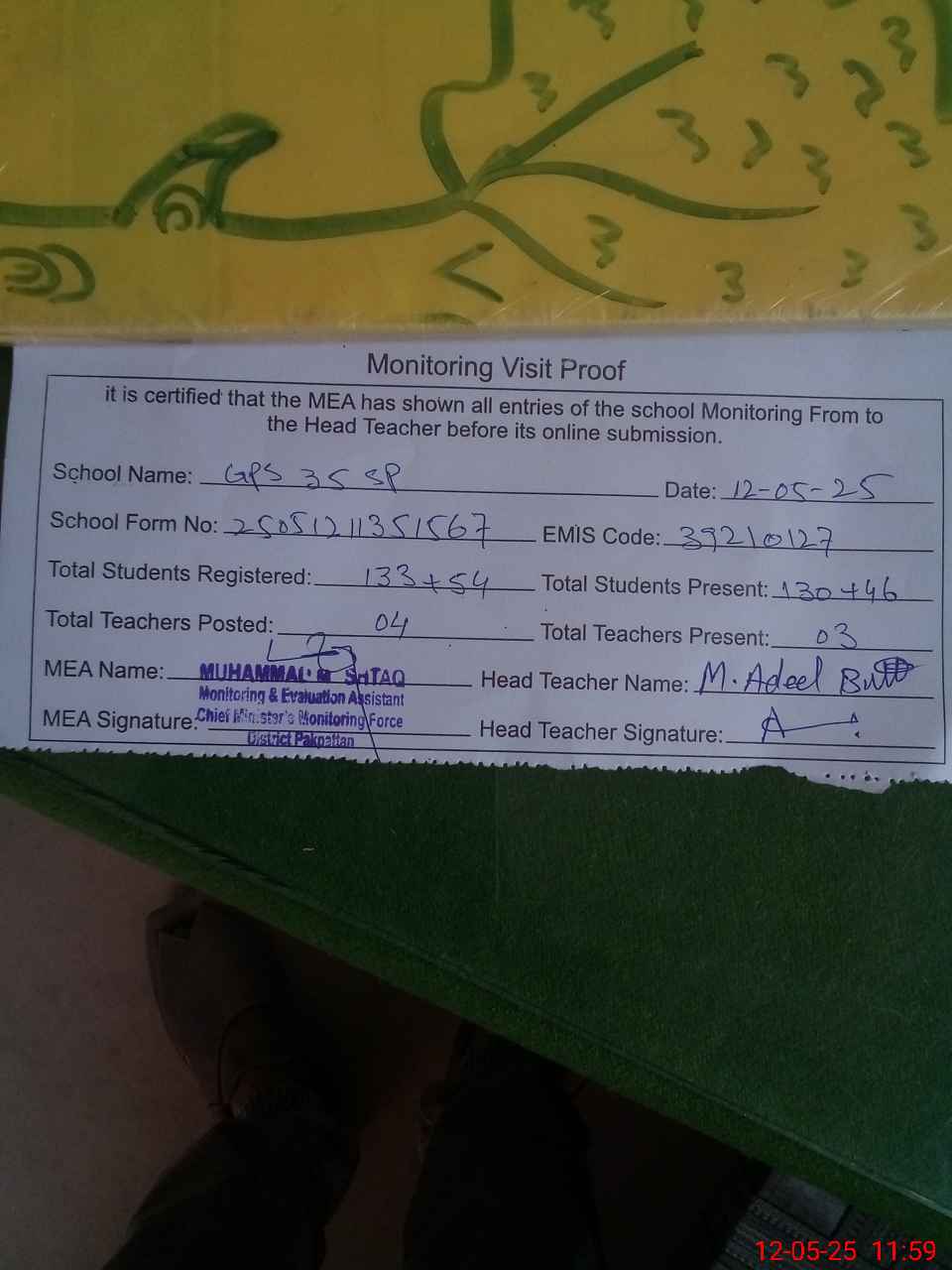 | Attendance Register | Head Teacher | MEA with School | Visit Proof |