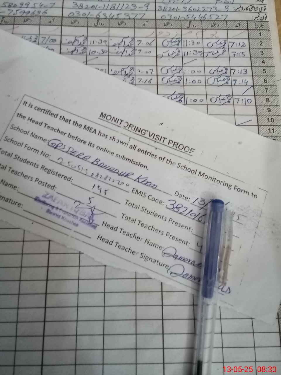 | Name: Qa**** Ab**** Designation: (School Headmaster's/Headmistress's) PST Phone/Cell Number: 03**** |