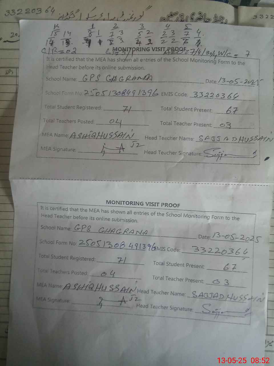 | Attendance Register | Head Teacher | MEA with School | Visit Proof |