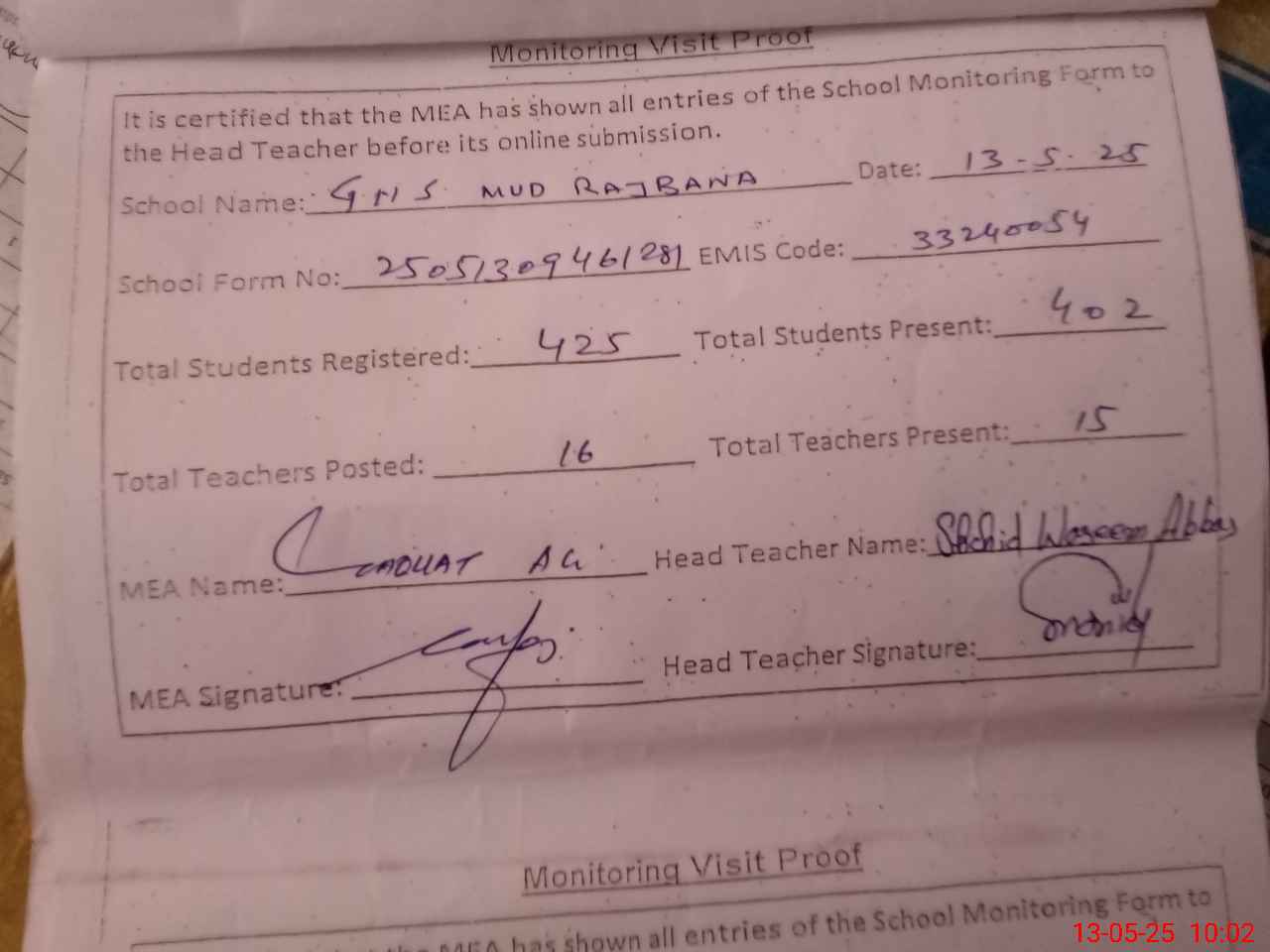 | Attendance Register | Head Teacher | MEA with School | Visit Proof |