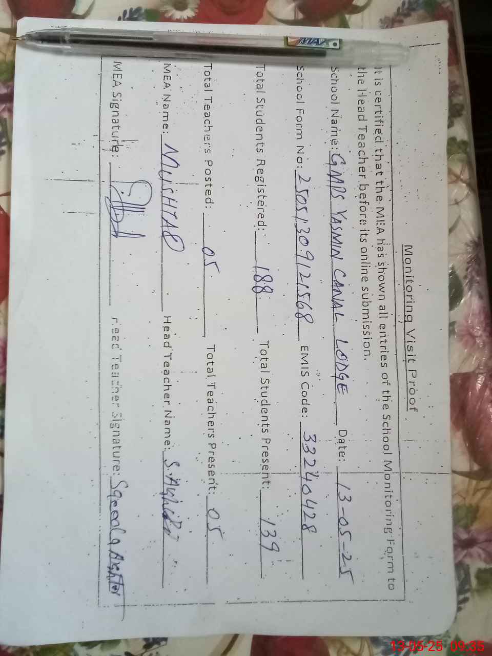 | Certified that this School was Inspected by the Undersigned MEA/DMO Today and the Information Stated Above is as Per Record. | |||||