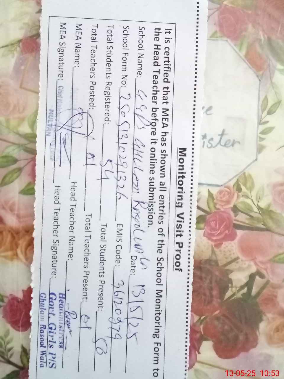 | Attendance Register | Head Teacher | MEA with School | Visit Proof |