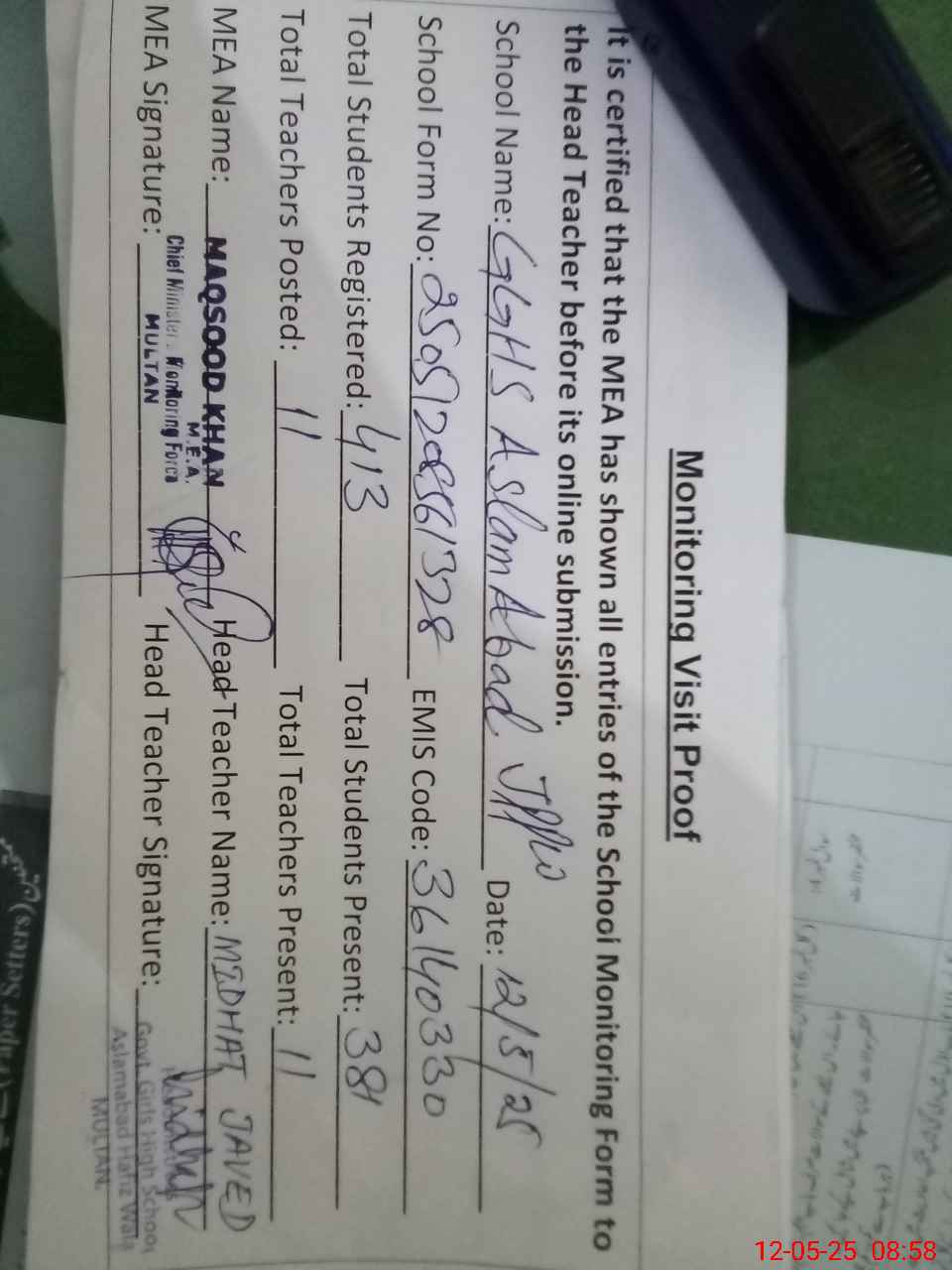 | Certified that this School was Inspected by the Undersigned MEA/DMO Today and the Information Stated Above is as Per Record. | |||||