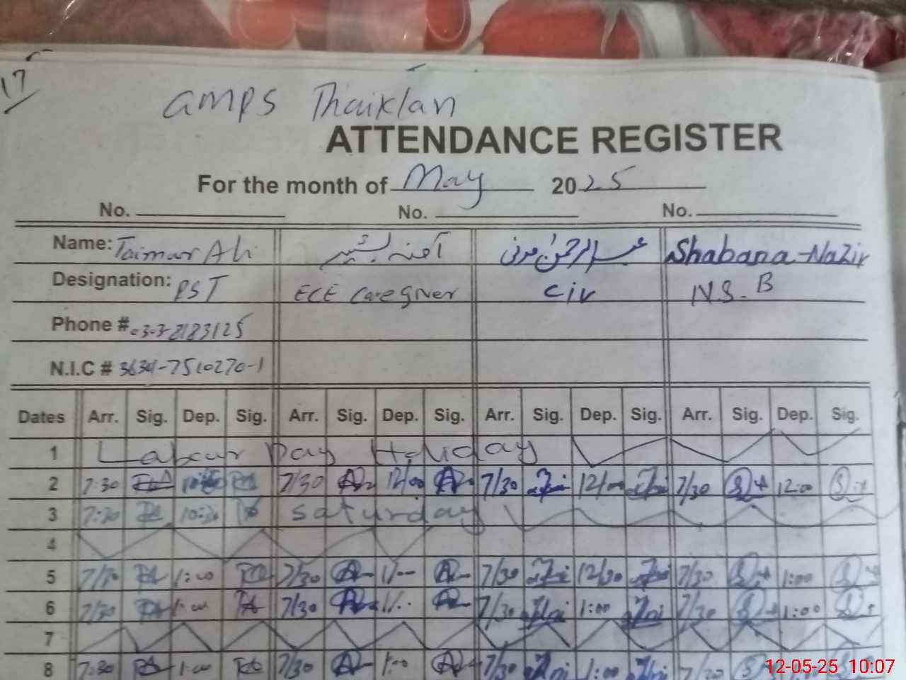 | CNIC | Full Name | Designation | R/C | Absence during last cal. month |