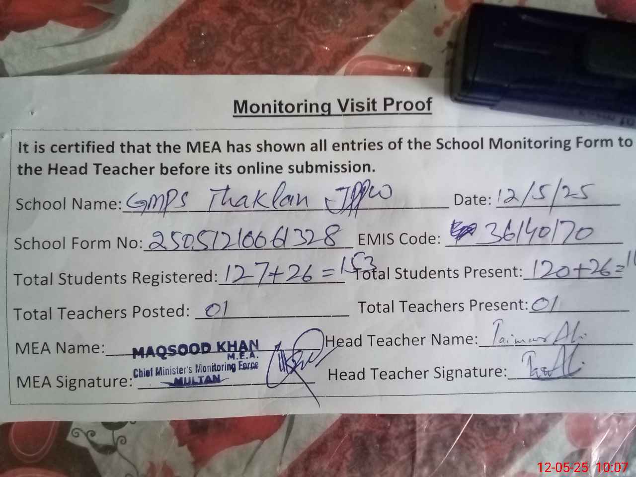 | Attendance Register | Head Teacher | MEA with School | Visit Proof |