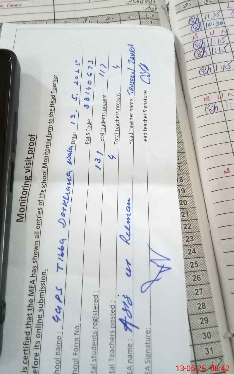 | Attendance Register | Head Teacher | MEA with School | Visit Proof |