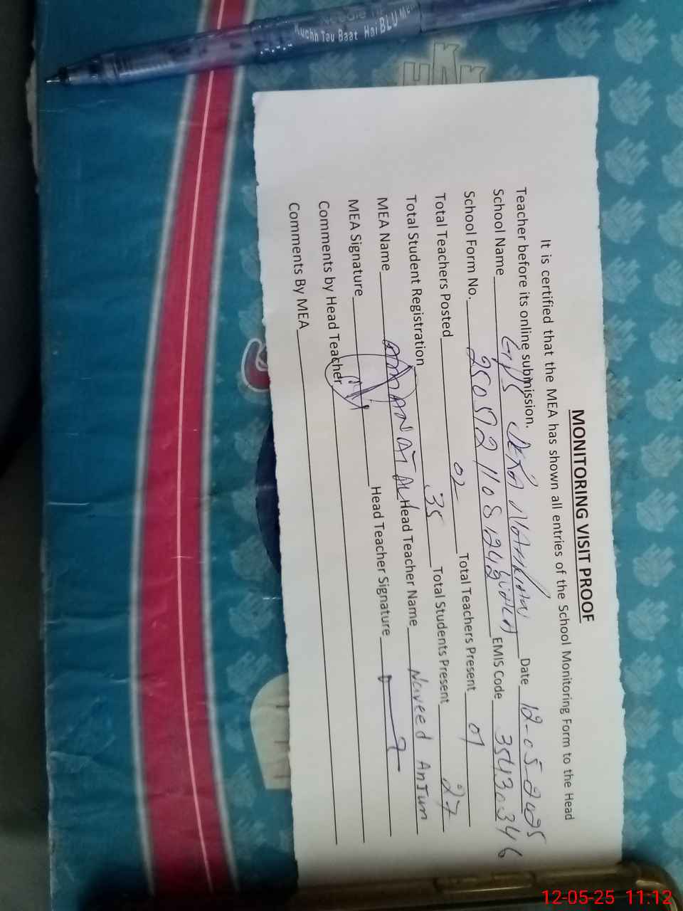 | Attendance Register | Head Teacher | MEA with School | Visit Proof |
