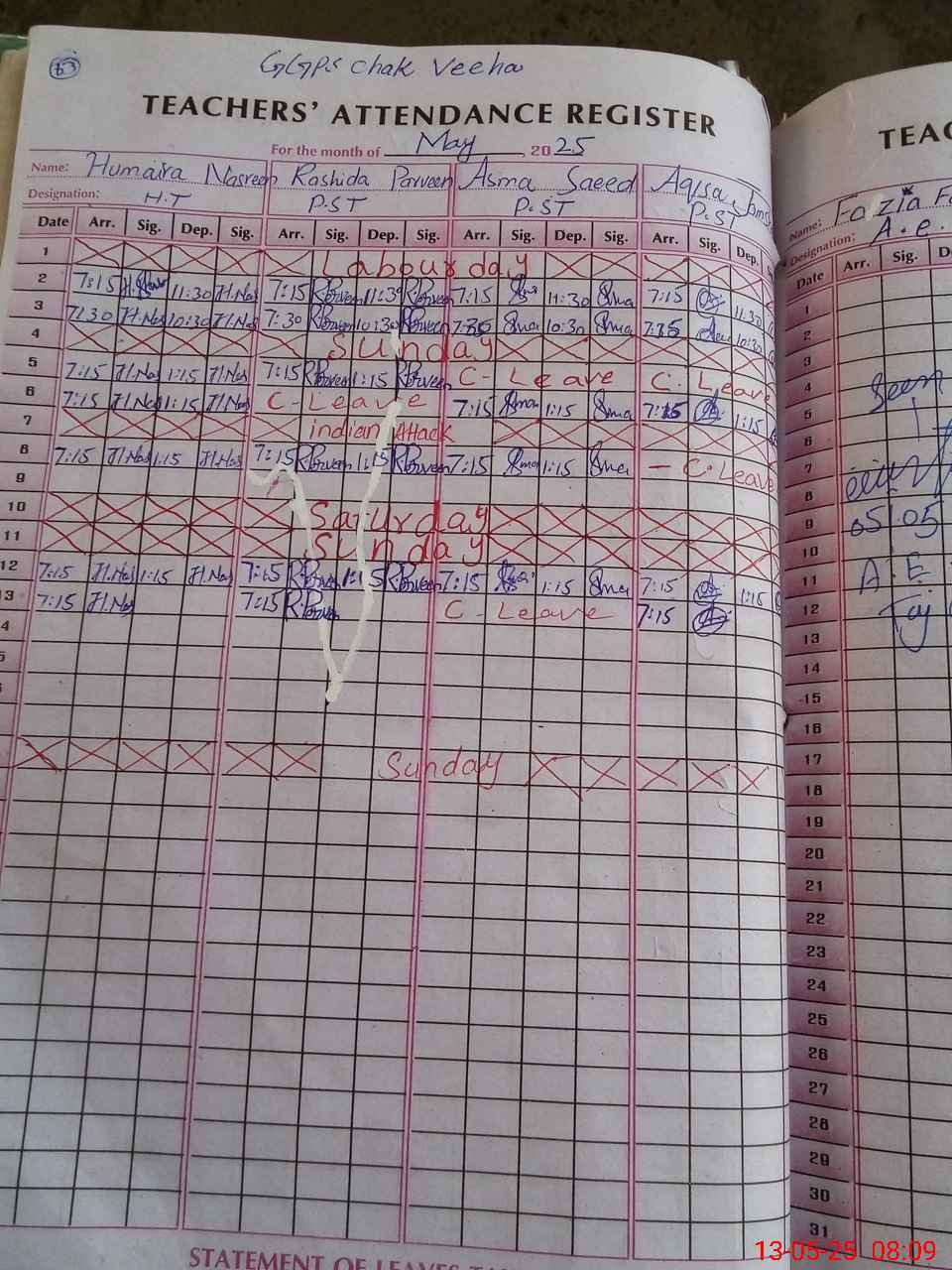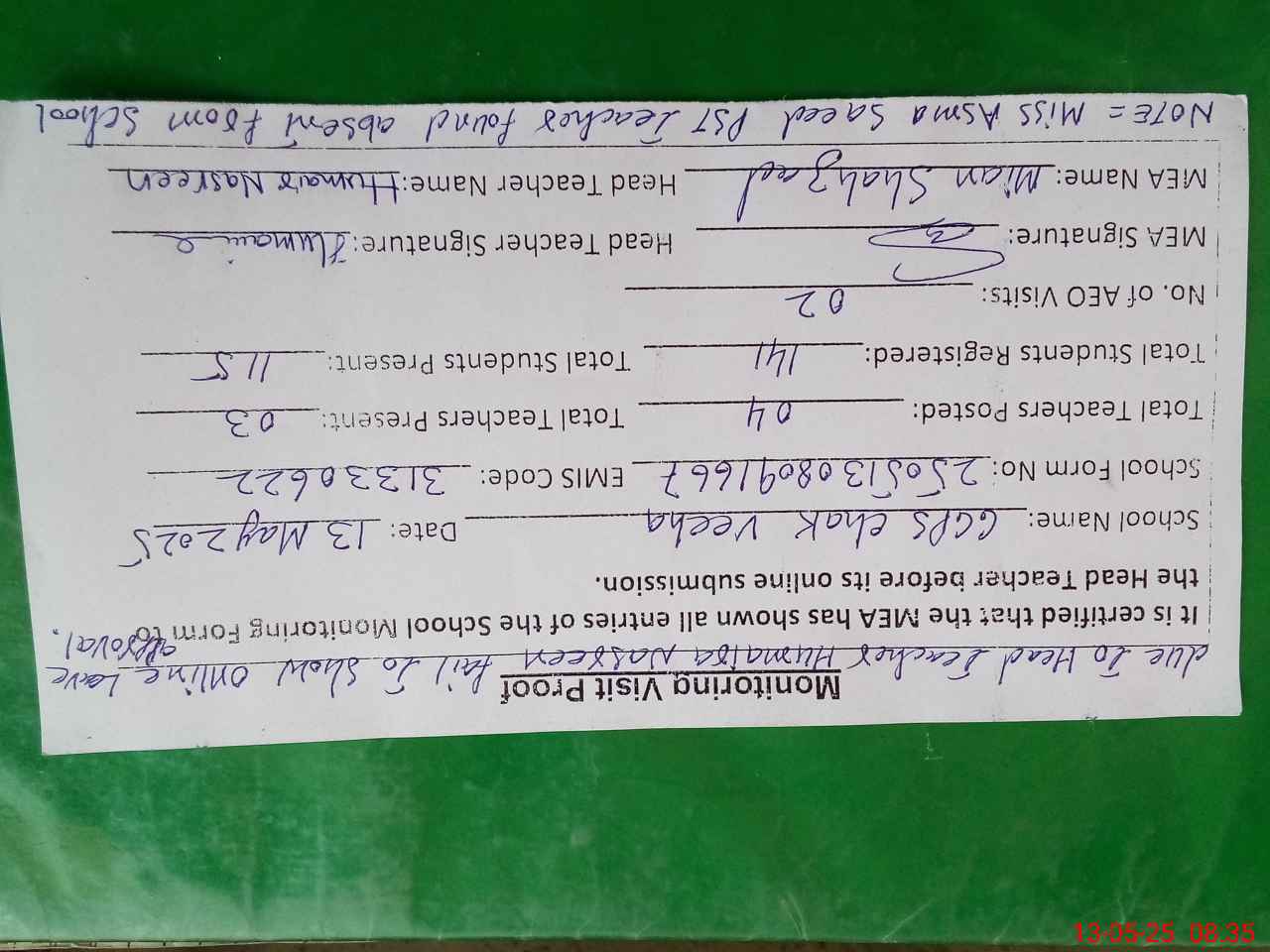 | Remarks (Use Separate Page if Required): Miss Asma Saeed PST teacher found absent from school during visit due to head teacher Miss Humaira Nasreen failed to show online leave approval | |||||