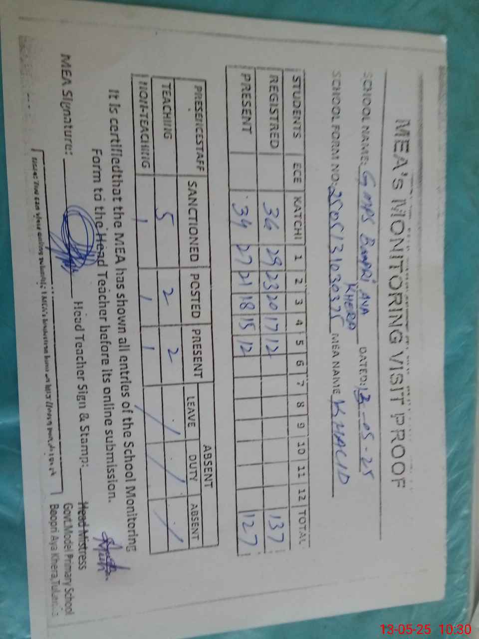 | Attendance Register | Head Teacher | MEA with School | Visit Proof |