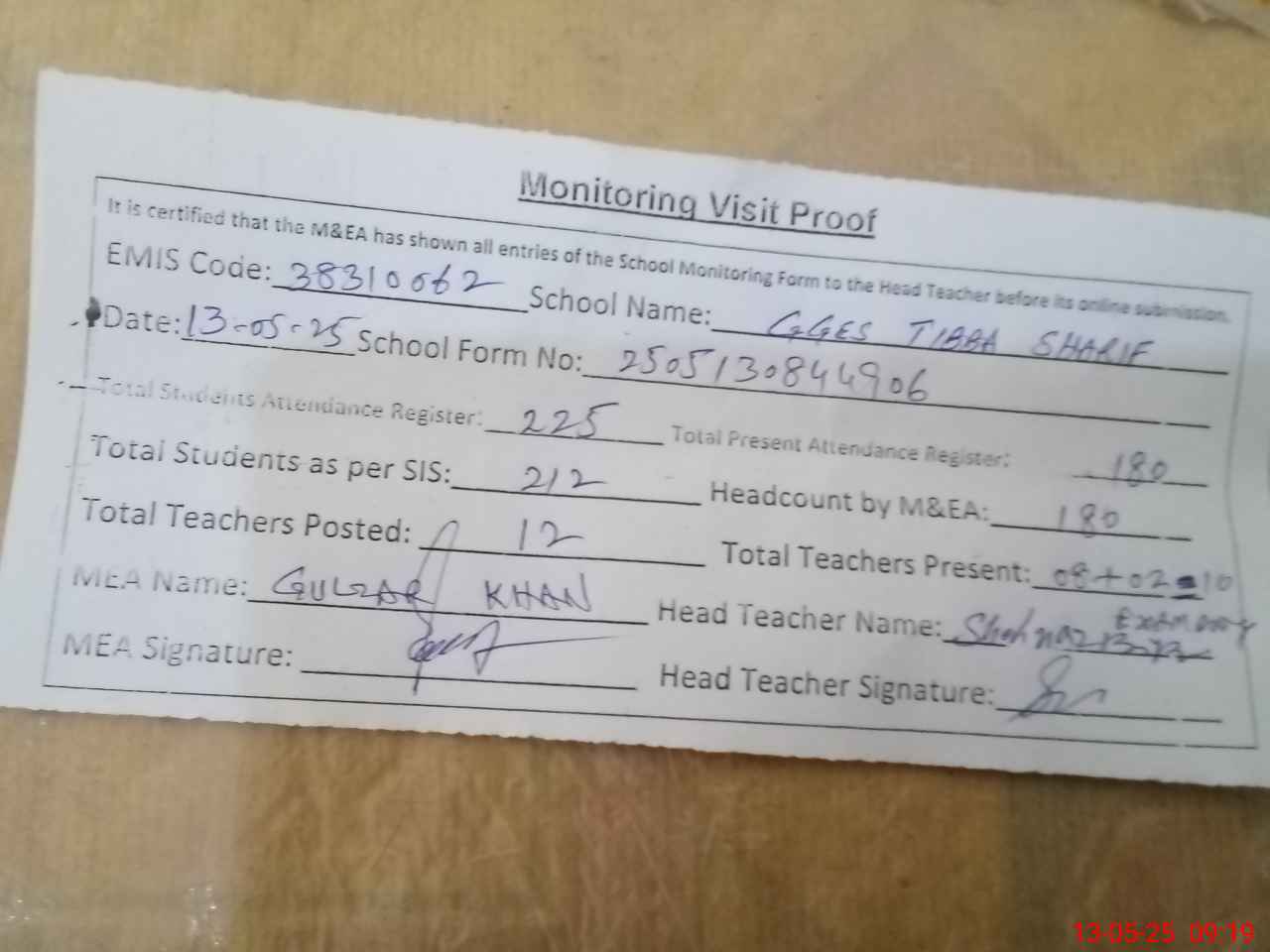 | Attendance Register | Head Teacher | MEA with School | Visit Proof |