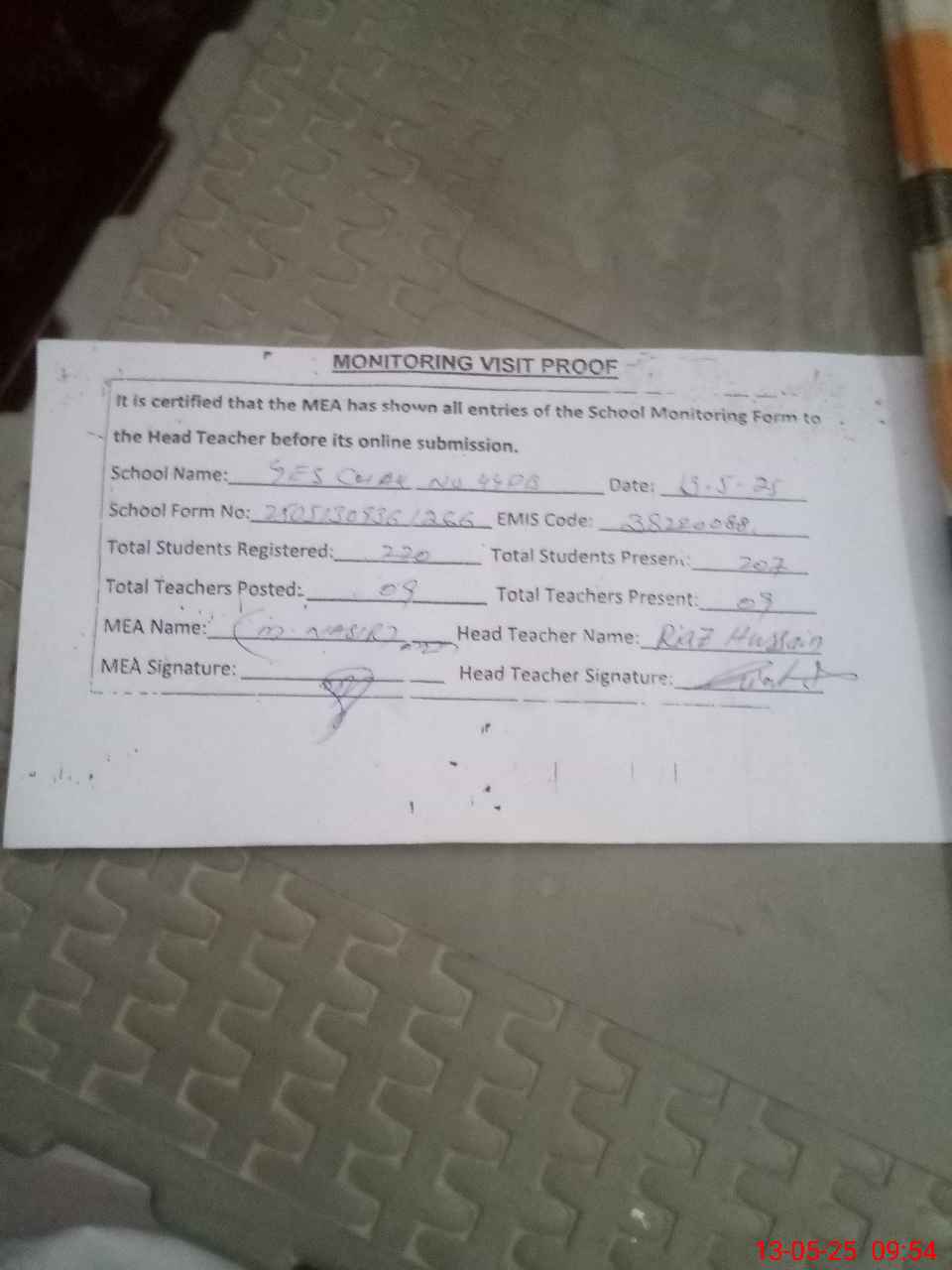 | Attendance Register | Head Teacher | MEA with School | Visit Proof |