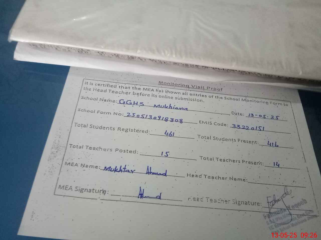 | Attendance Register | Head Teacher | MEA with School | Visit Proof |
