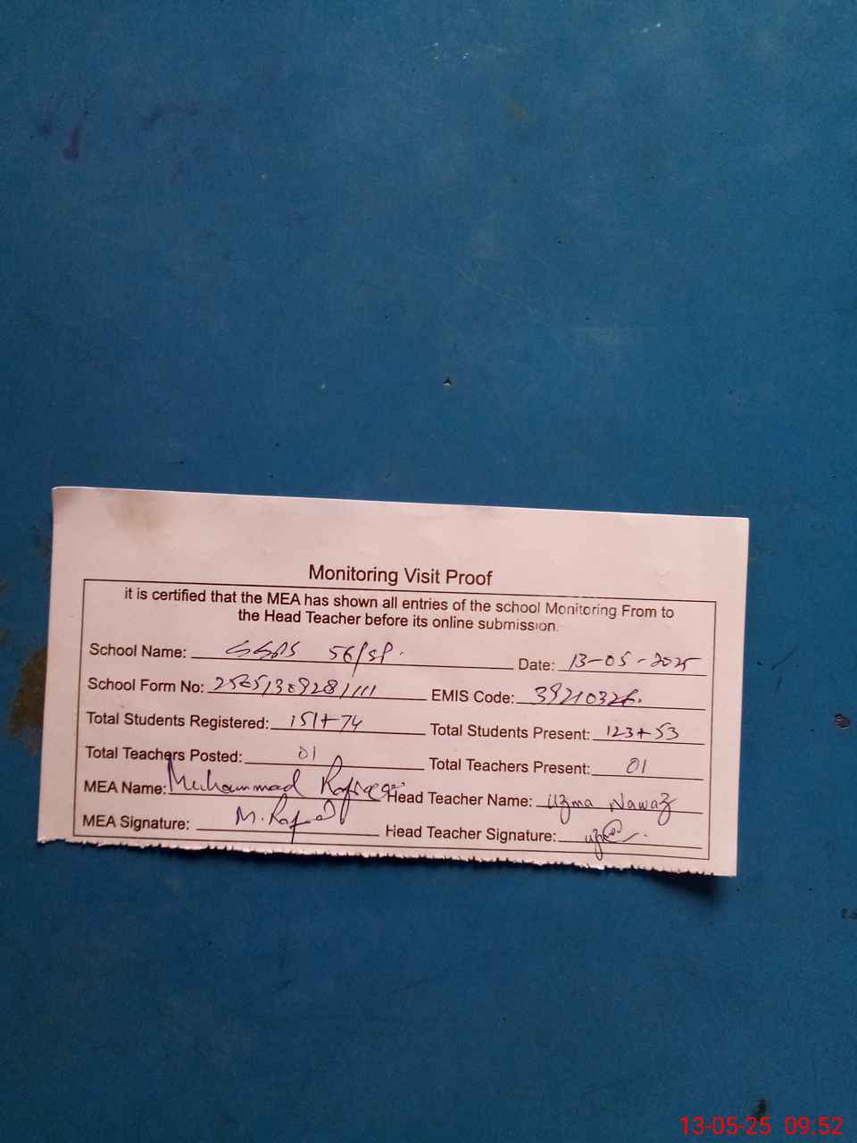 | Attendance Register | Head Teacher | MEA with School | Visit Proof |