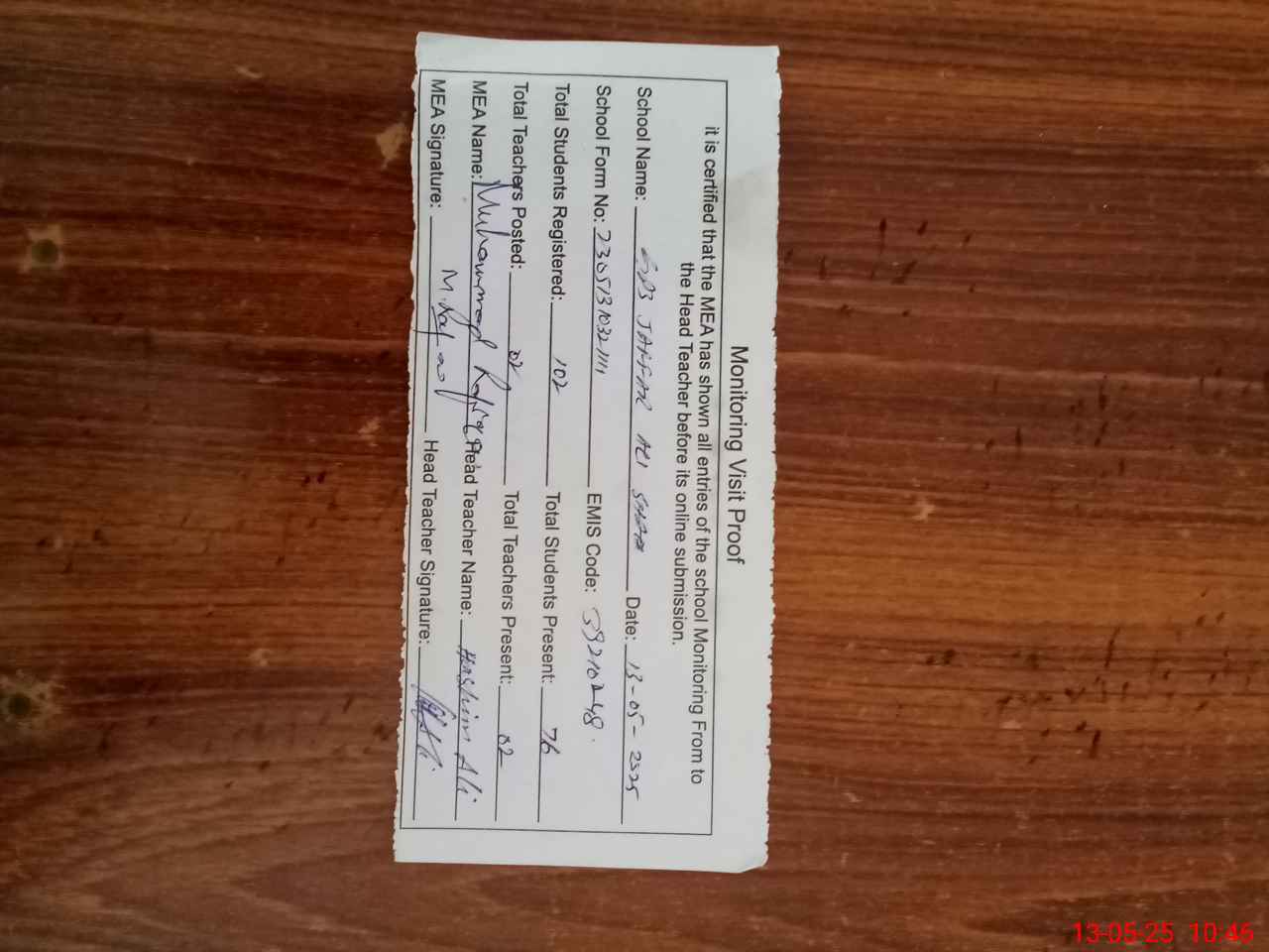 | Attendance Register | Head Teacher | MEA with School | Visit Proof |