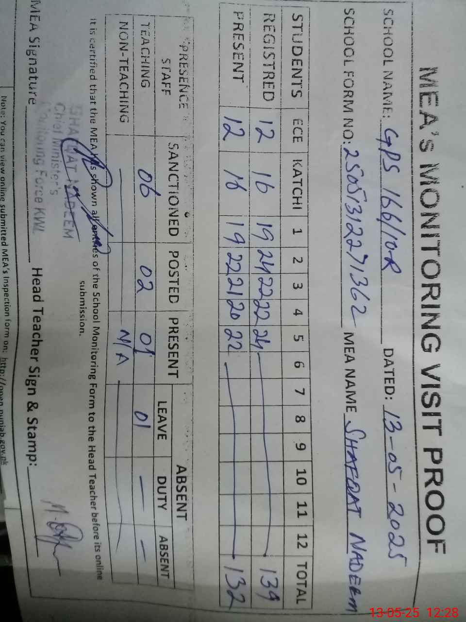 | Attendance Register | Head Teacher | MEA with School | Visit Proof |