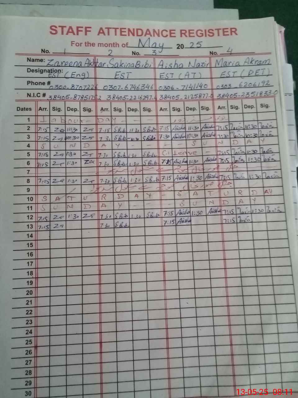 | CNIC | Full Name | Designation | R/C | Absence During Last Calender Month |