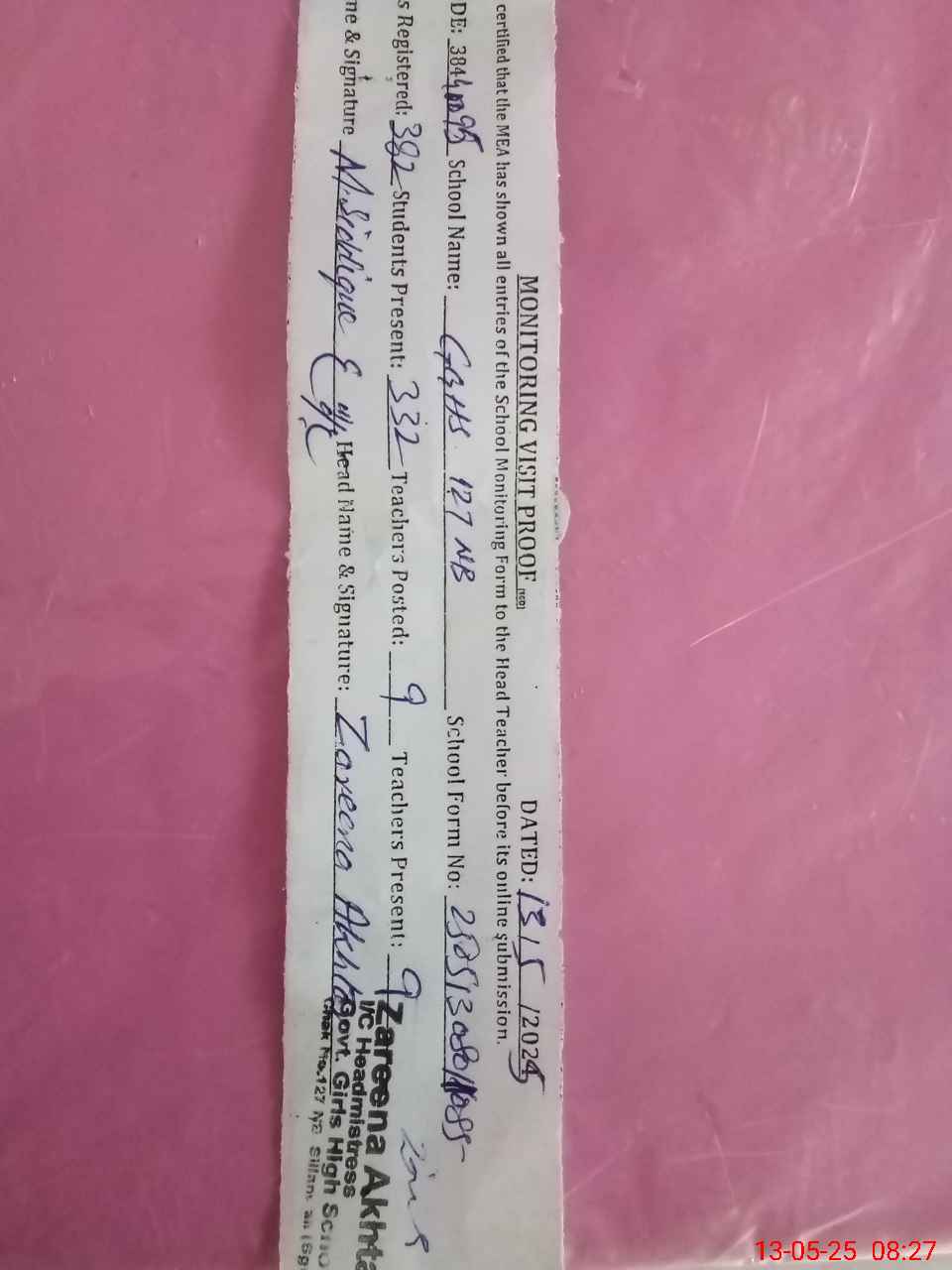 | Name: As**** Sh**** Designation: (School Headmaster's/Headmistress's) SST SCI Phone/Cell Number: 03**** |