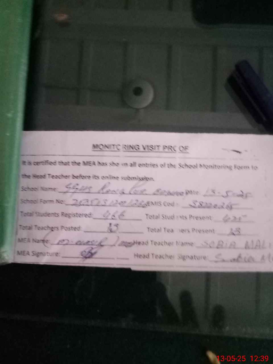 | Attendance Register | Head Teacher | MEA with School | Visit Proof |