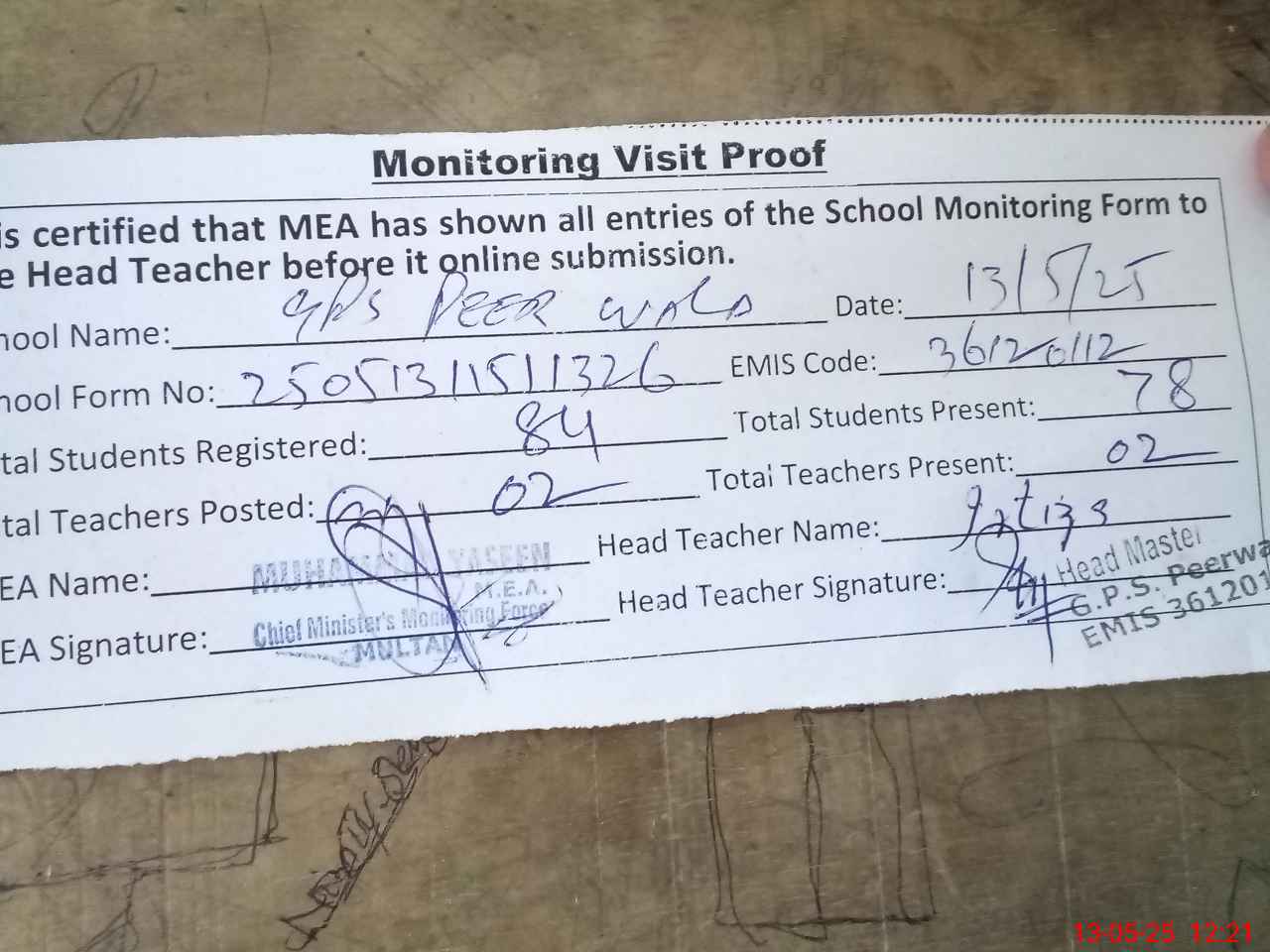 | Attendance Register | Head Teacher | MEA with School | Visit Proof |