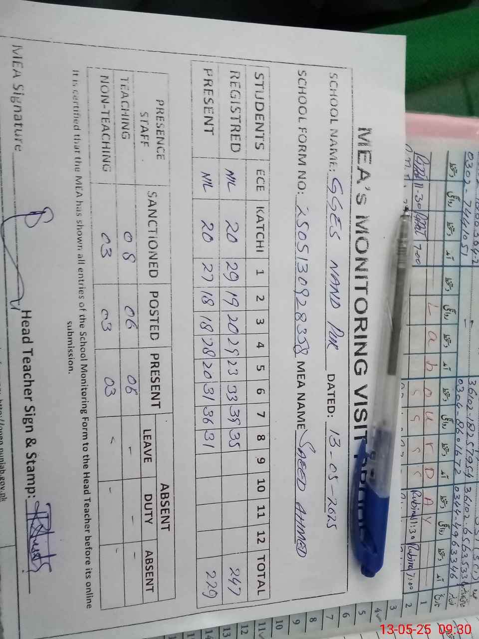| Attendance Register | Head Teacher | MEA with School | Visit Proof |