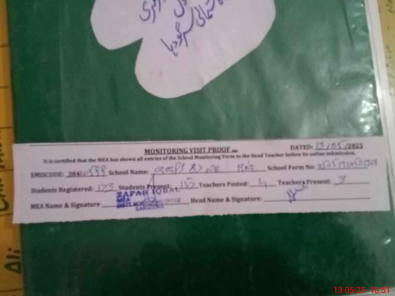 | Attendance Register | Head Teacher | MEA with School | Visit Proof |