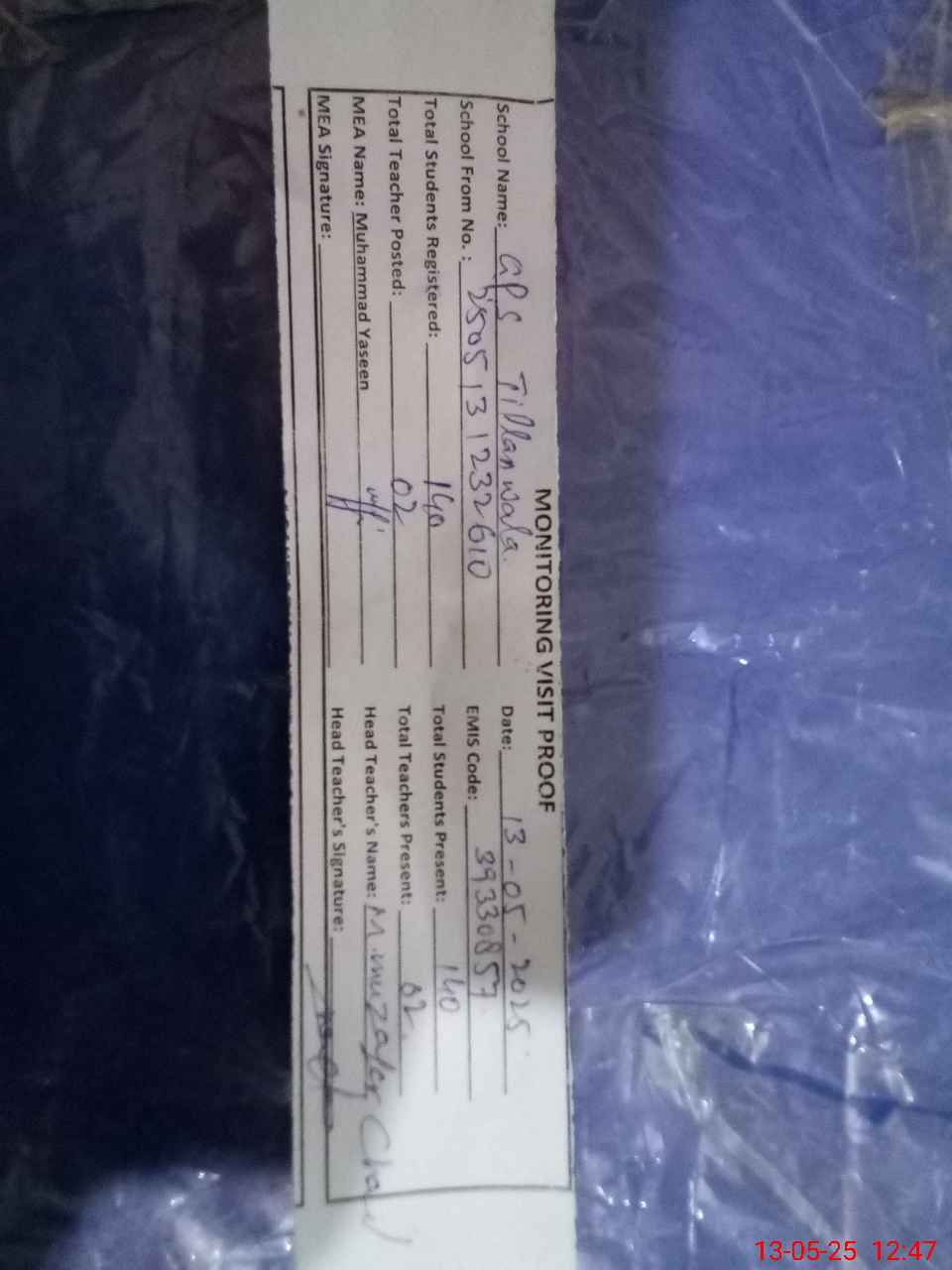 | Attendance Register | Head Teacher | MEA with School | Visit Proof |