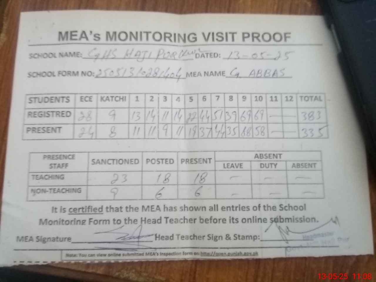 | Attendance Register | Head Teacher | MEA with School | Visit Proof |