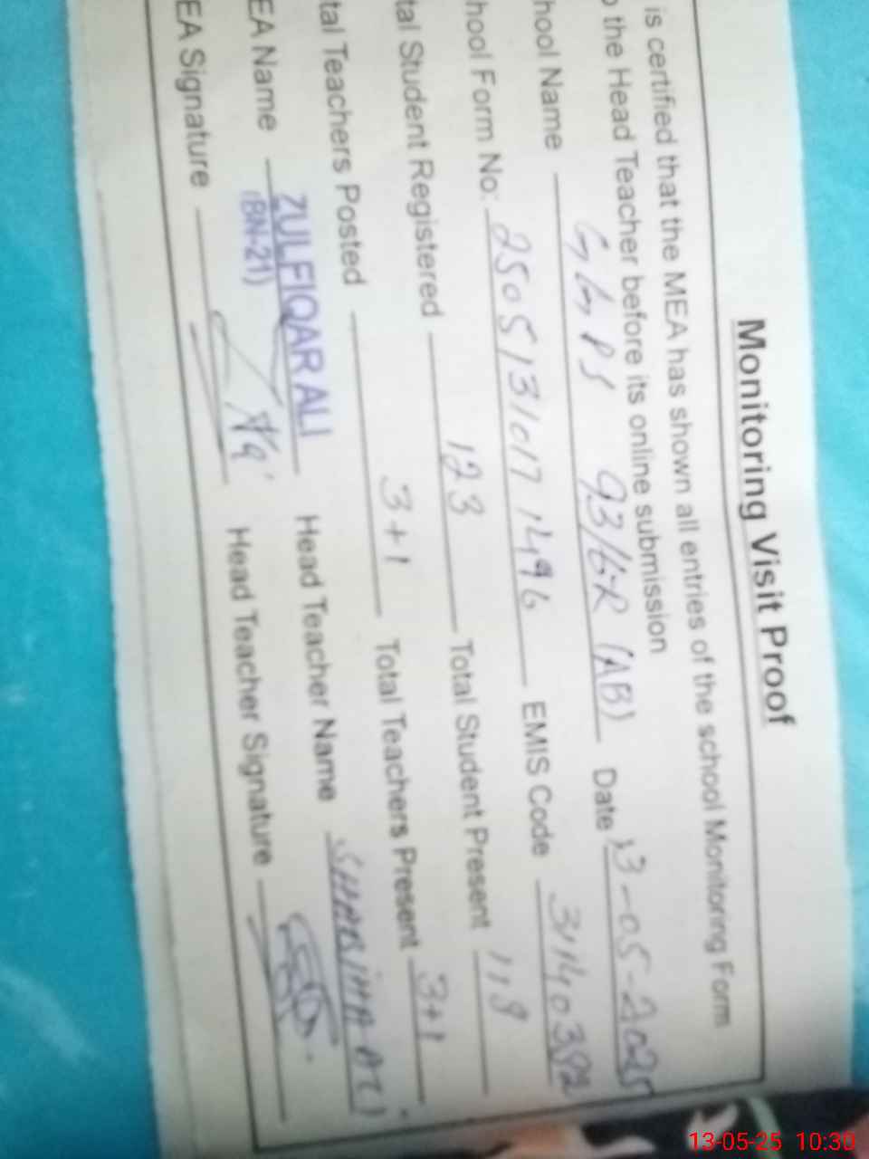 | Name: SH**** AL**** Designation: (School Headmaster's/Headmistress's) EST G Phone/Cell Number: 03**** |