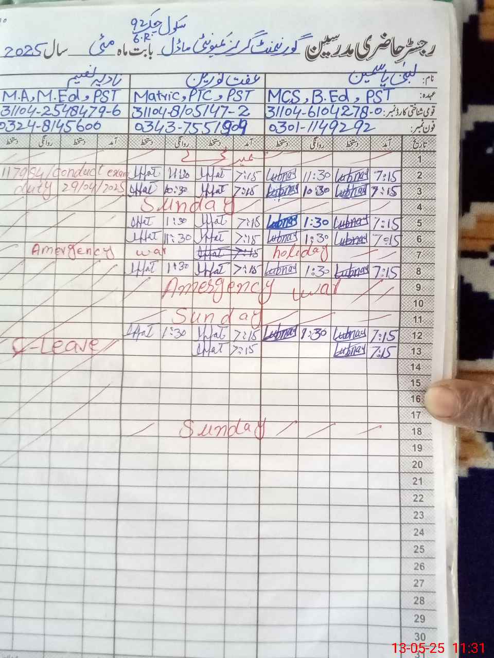 | CNIC | Full Name | Designation | R/C | Absence During Last Calender Month |