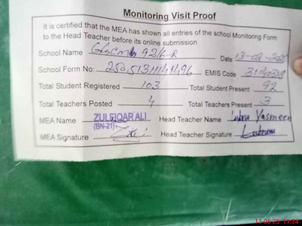 | Attendance Register | Head Teacher | MEA with School | Visit Proof |