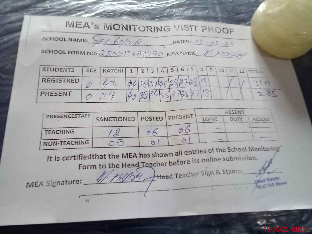 | Attendance Register | Head Teacher | MEA with School | Visit Proof |