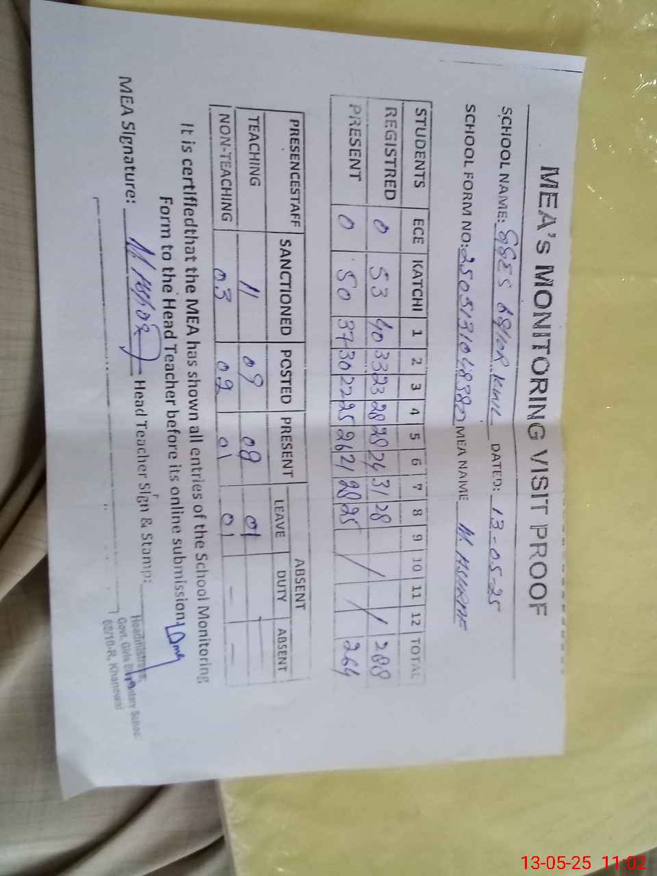| Attendance Register | Head Teacher | MEA with School | Visit Proof |