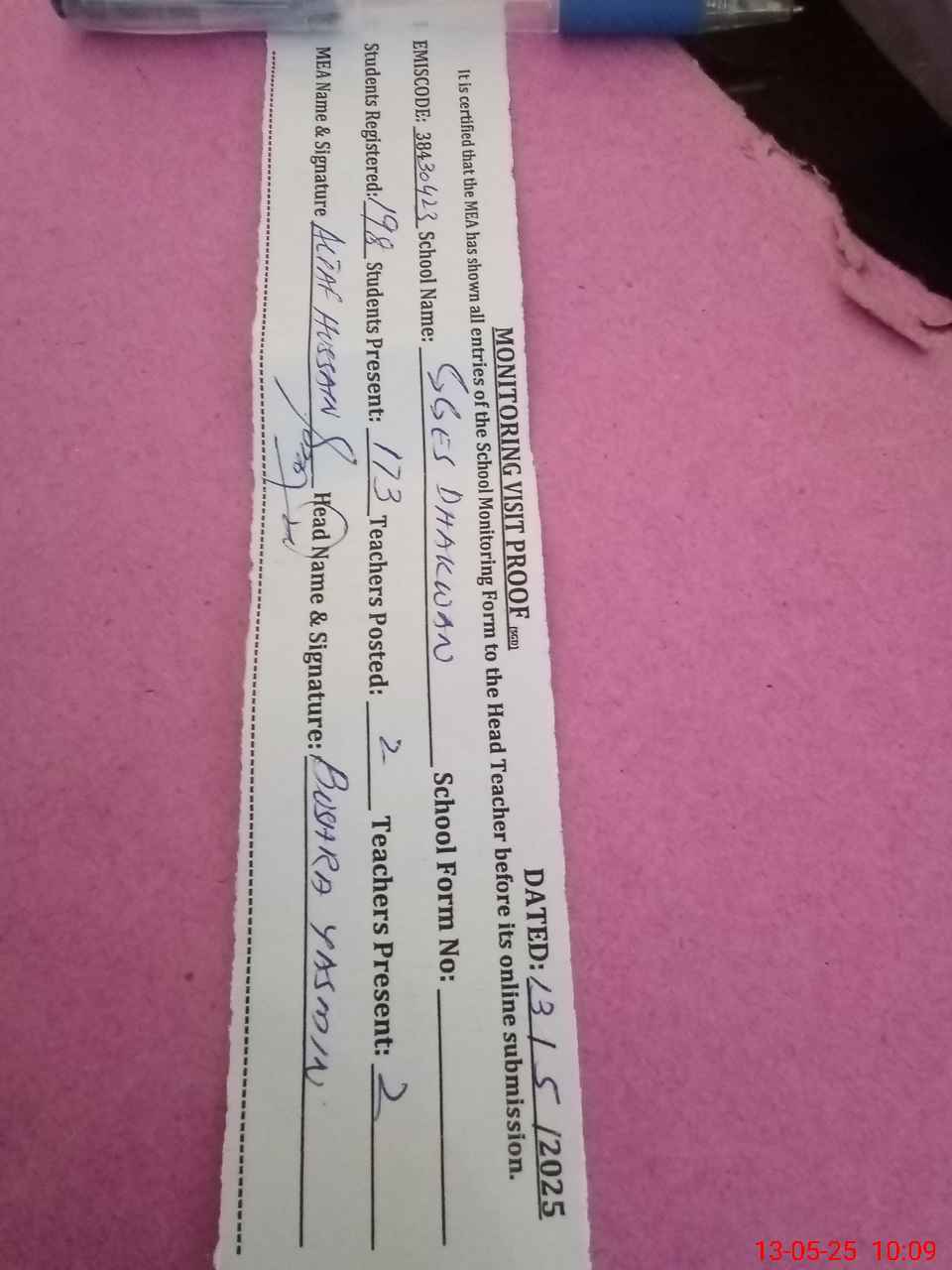 | Certified that this School was Inspected by the Undersigned MEA/DMO Today and the Information Stated Above is as Per Record. | |||||